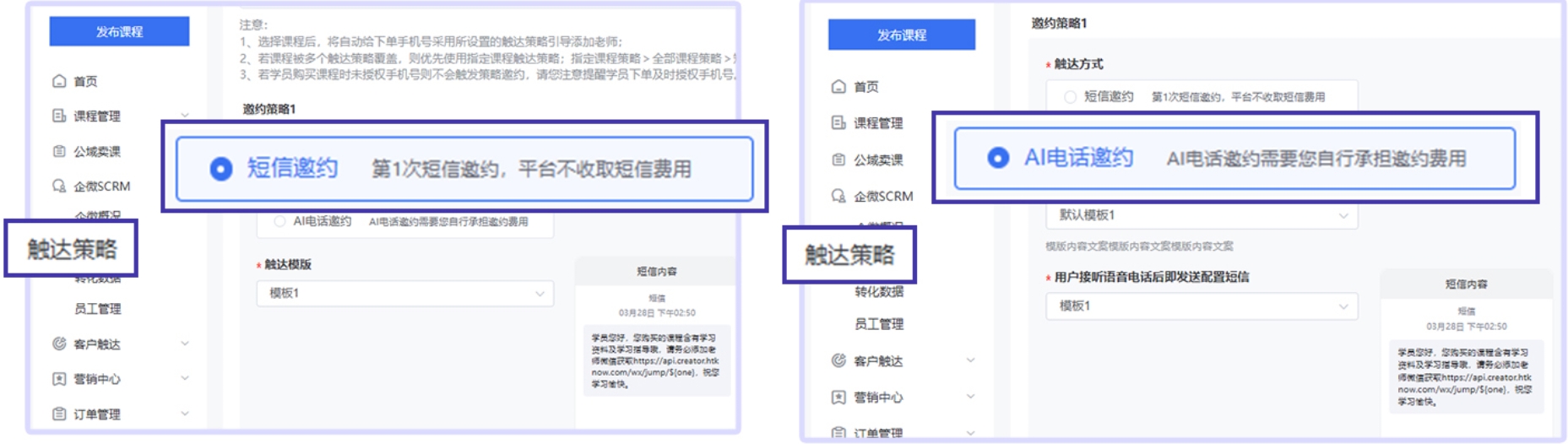 自定义配置AI电话/短信自动触达策略,满足策略条件的学员将自动为其发送短信或AI电话提醒,提升公转私效率,实现学员促活转化!
